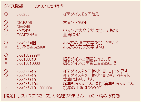 | … | 17126/02/23(月)13:19:14 ID:.OZhAev6No.1404776155+ちなみに私はダイスを振る式にそのまま文章くっつけても機能するのかいまだに分かってなくて半角スペースで誤魔化す癖があります |