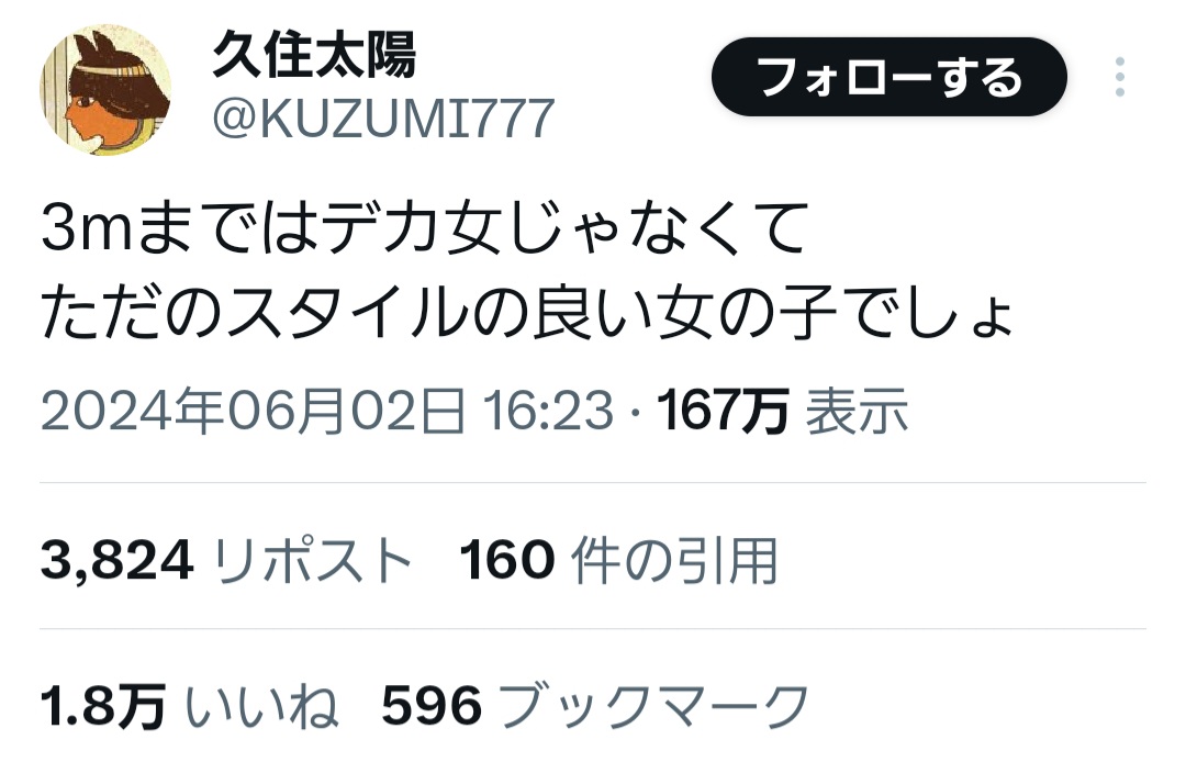 | … | 3826/02/23(月)13:52:12No.1404785427そうだねx3>>身長195前後のB150以上を出してもいいですよ? |