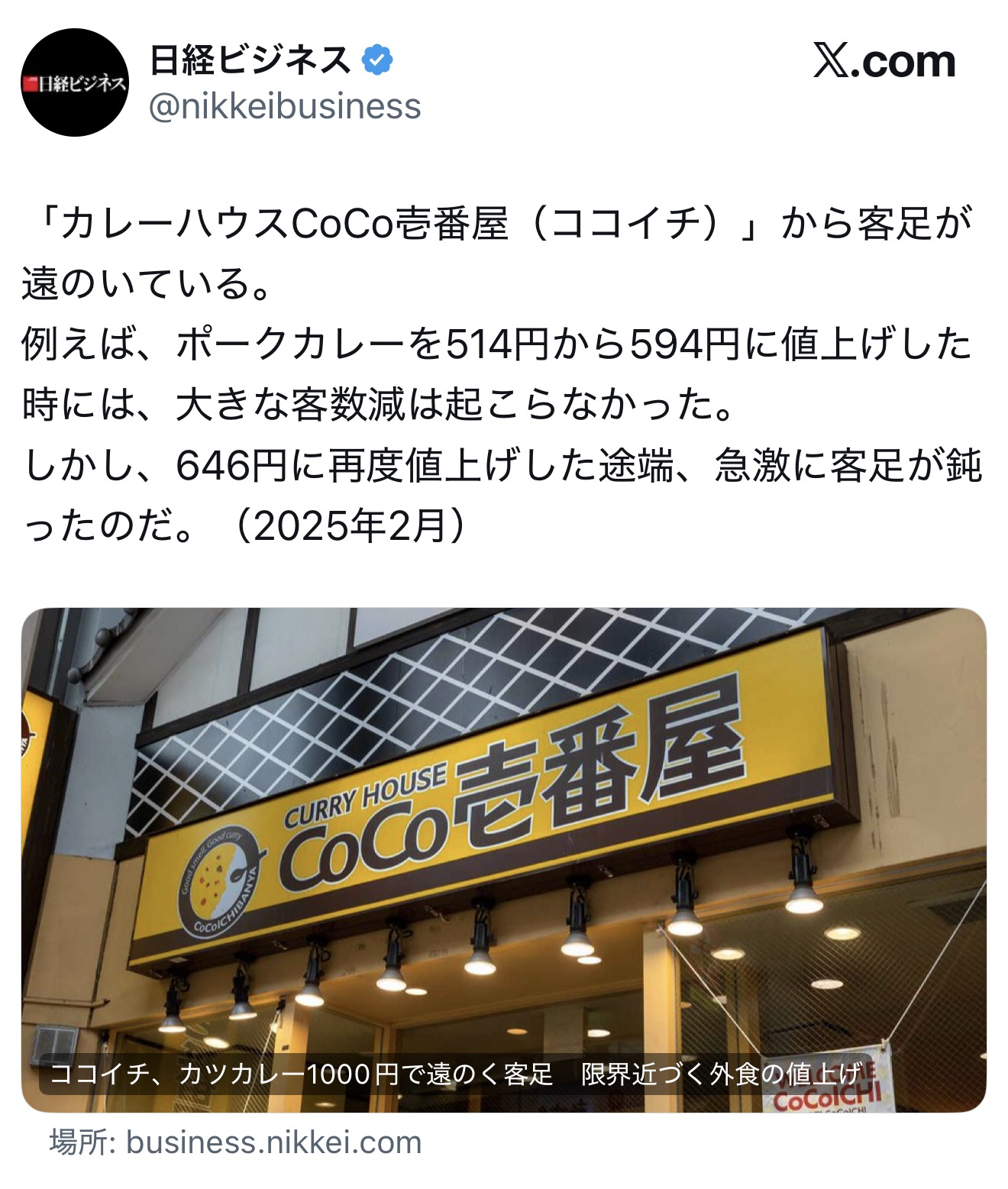 | … | 8226/02/23(月)12:35:39No.1404762501そうだねx8>ちなみにCoCo壱は客数は確かに減ってるけど売り上げは横ばい |
