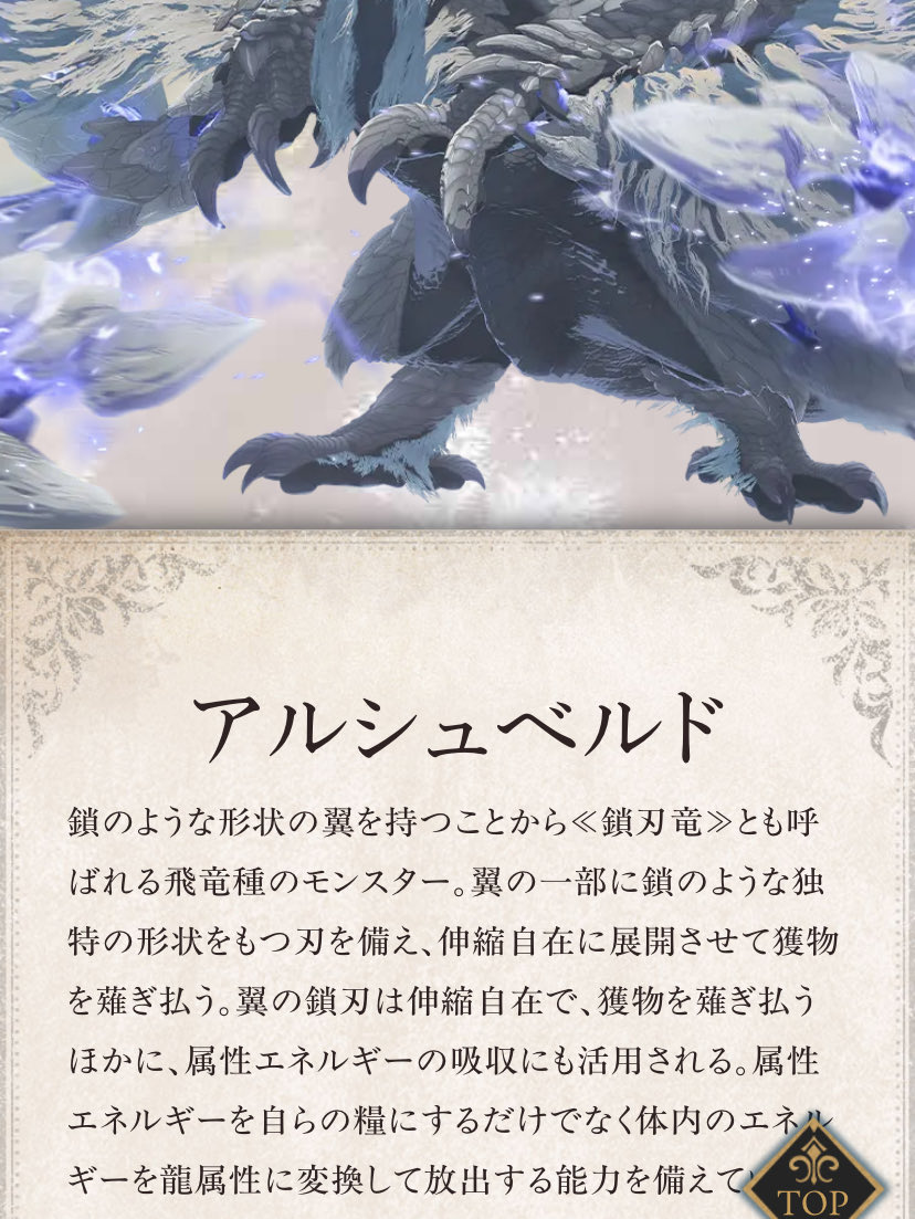 | … | 17526/02/23(月)16:43:29No.1404829617+鎖のような形状の翼を持つことから≪鎖刃竜≫とも呼ばれる飛竜種のモンスター。 |