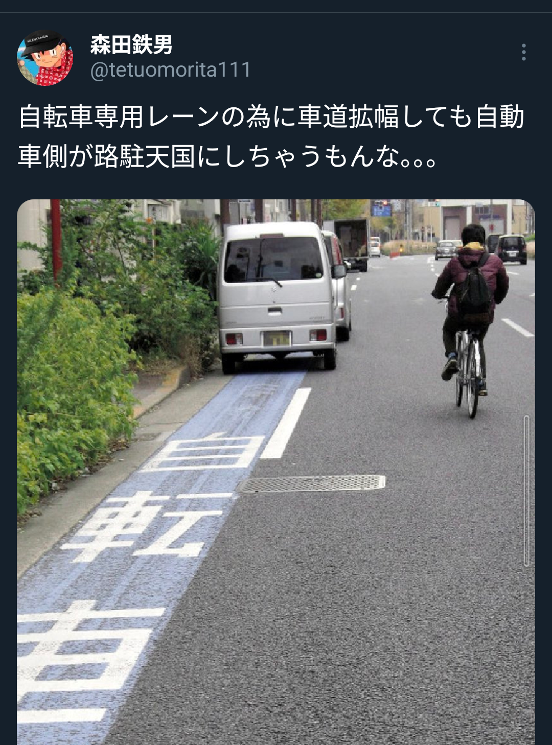 | … | 6826/02/23(月)17:41:44No.1404847097そうだねx1車道では自動車が優先なんだから自転車レーンに駐車するのも問題無いよ |