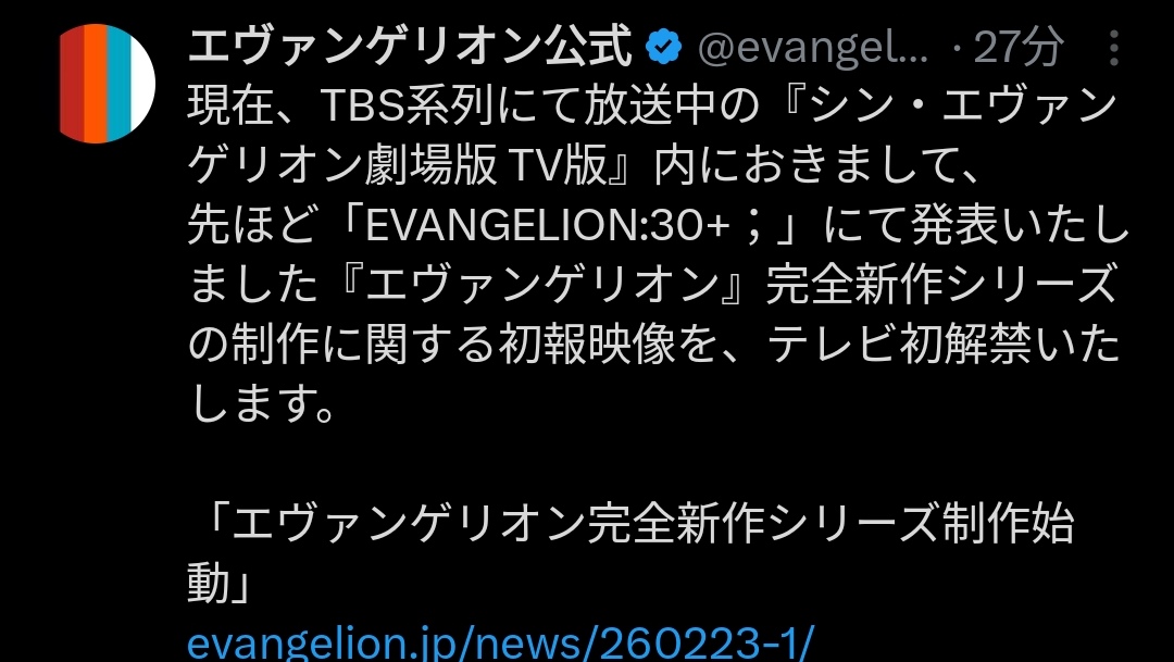 | … | 96626/02/23(月)20:51:20No.1404925202+>現在、TBS系列にて放送中の『シン・エヴァンゲリオン劇場版 TV版』内におきまして、 |