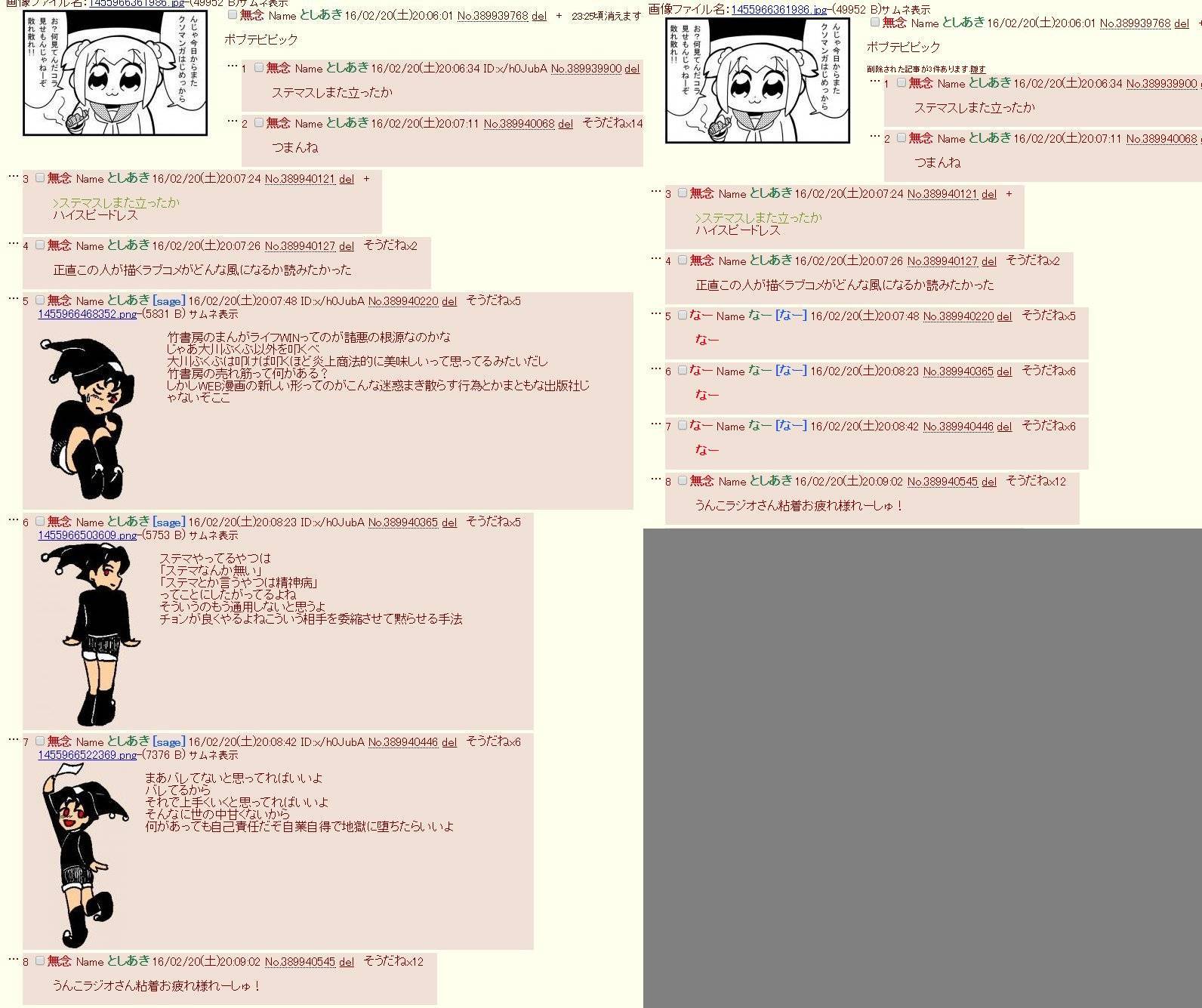 | … | 1426/02/23(月)22:12:26No.1404973760そうだねx2KOUSHIROUスクすると隔離される掲示板になったらしいな |