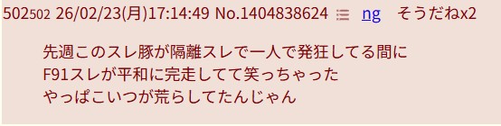 | … | 37426/02/23(月)23:05:43No.1404995726そうだねx1コピペ元の文面とっくにバレてるのに延々続けてるのやっぱり知能に問題あるだろう… |