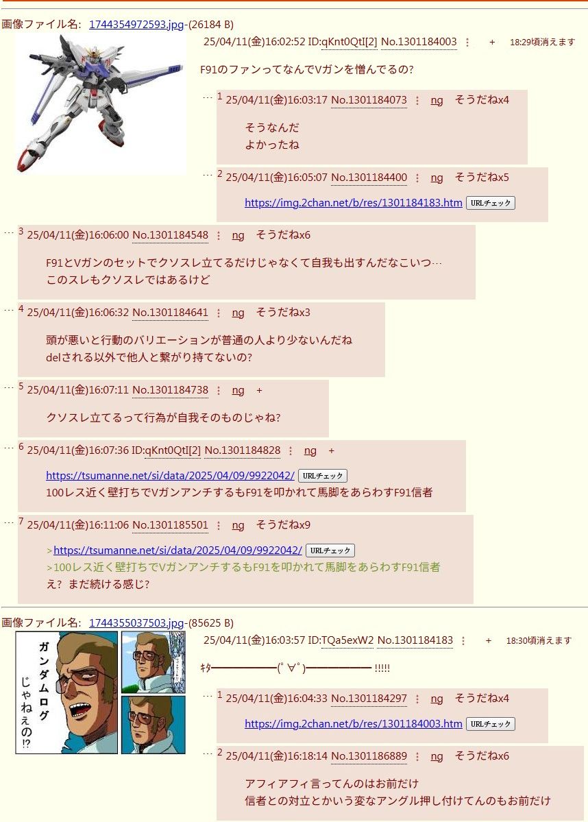 | … | 6426/02/23(月)22:23:49No.1404978750+そもそもなんでVとF91に粘着するようになったの? |