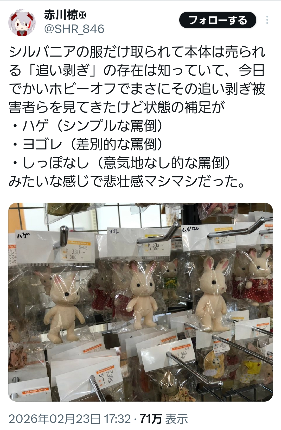 | … | 2926/02/24(火)00:12:15No.1405022266+昔イスとかぬいぐるみ売ってその金で裸のシルバニア買ってた「」いたの思い出した |