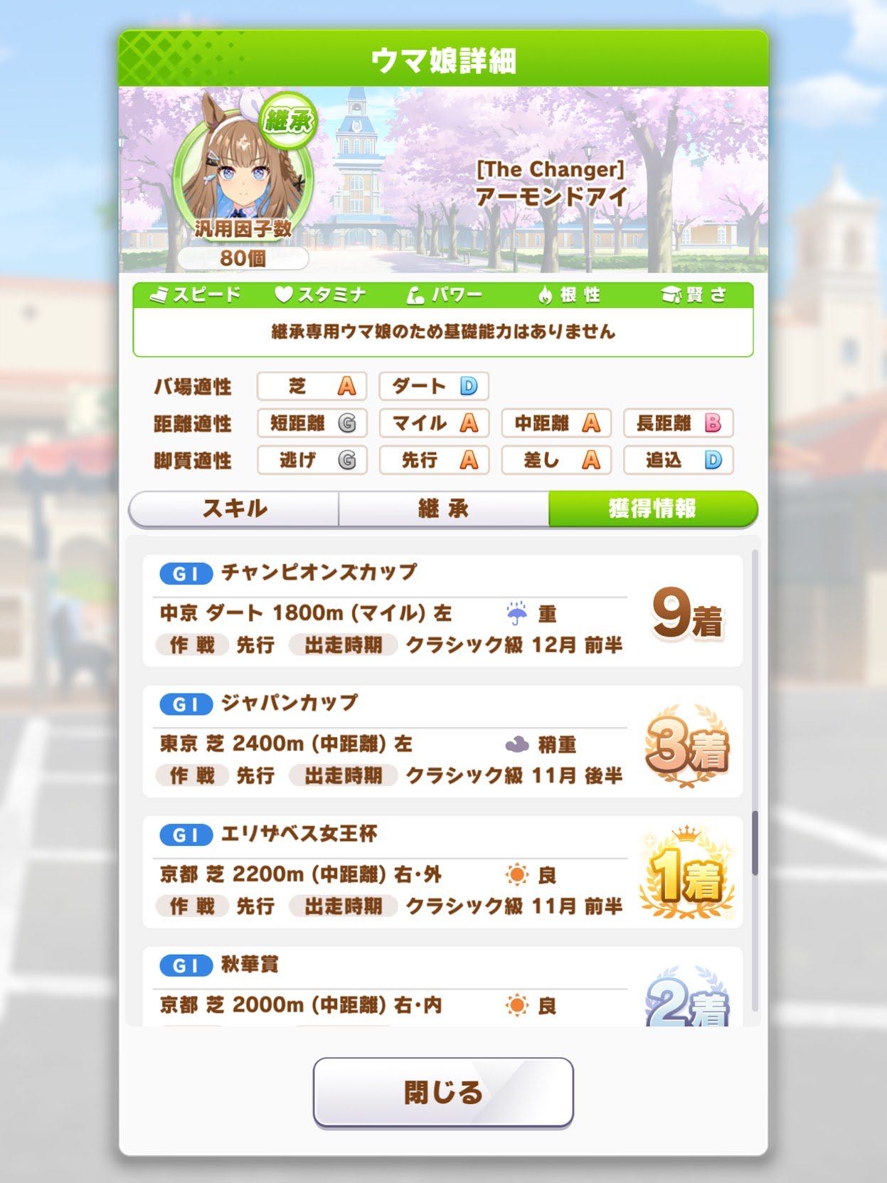 | … | 6126/02/24(火)16:45:36No.1405161755+10対継承作ってもステ因子と距離因子が3にならないのだ〜 |