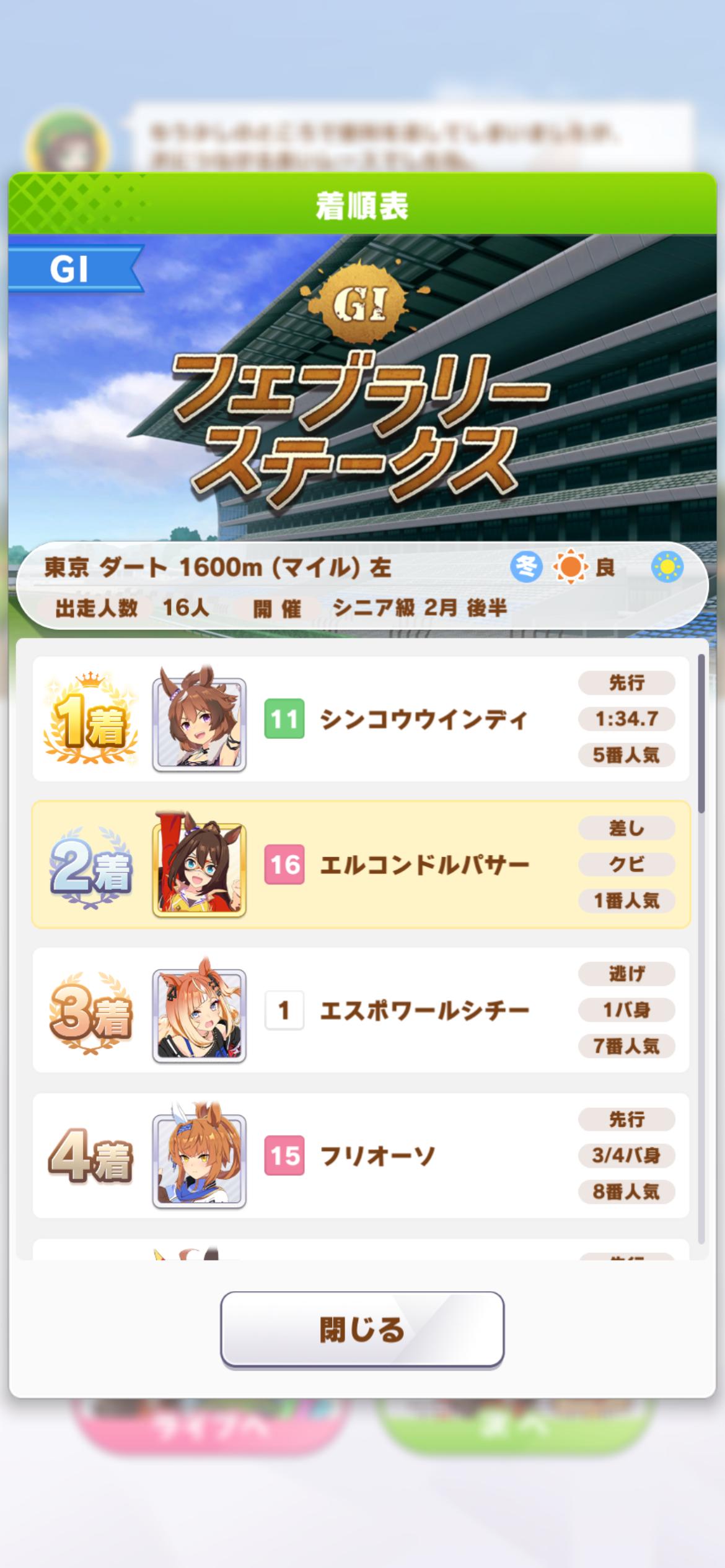 | … | 25526/02/24(火)17:57:42No.1405178801+デルマーは坂無いけど賢さ1800まで上げられるから坂あるコースだと賢さ重要な気がするのだ |