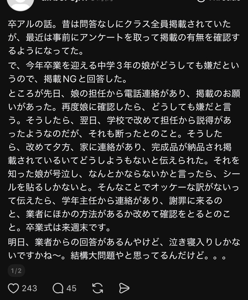 | … | 2726/02/24(火)18:16:09No.1405183923そうだねx3経費削減できるし卒業アルバム自体もう作るのをやめようぜ |