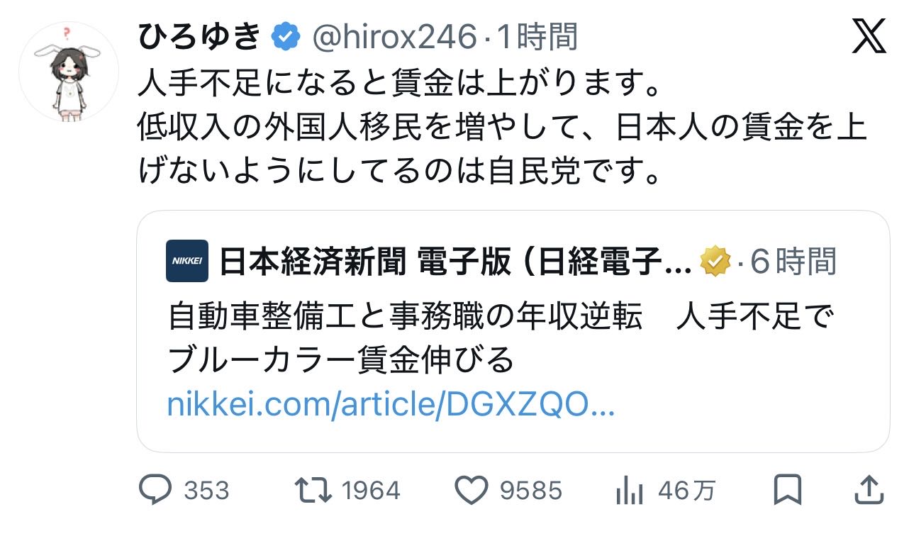 人手不足が全部外国人で解消されてればひろゆきの言い分も通るかもしれないけどそうなってない