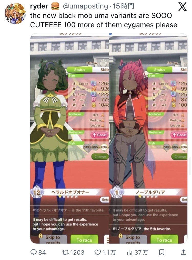 | … | 1126/02/25(水)08:21:57No.1405359259そうだねx23>黒人ウマ娘の反響が海外勢からめちゃくちゃ良くて今後の展開性のブルーオーシャンを感じる |