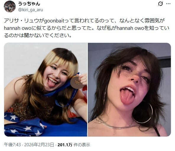 | … | 326/02/25(水)13:31:58No.1405416315+メでアリサはgoonbait(シコれるとか抜けるとか)だって話題になってて |