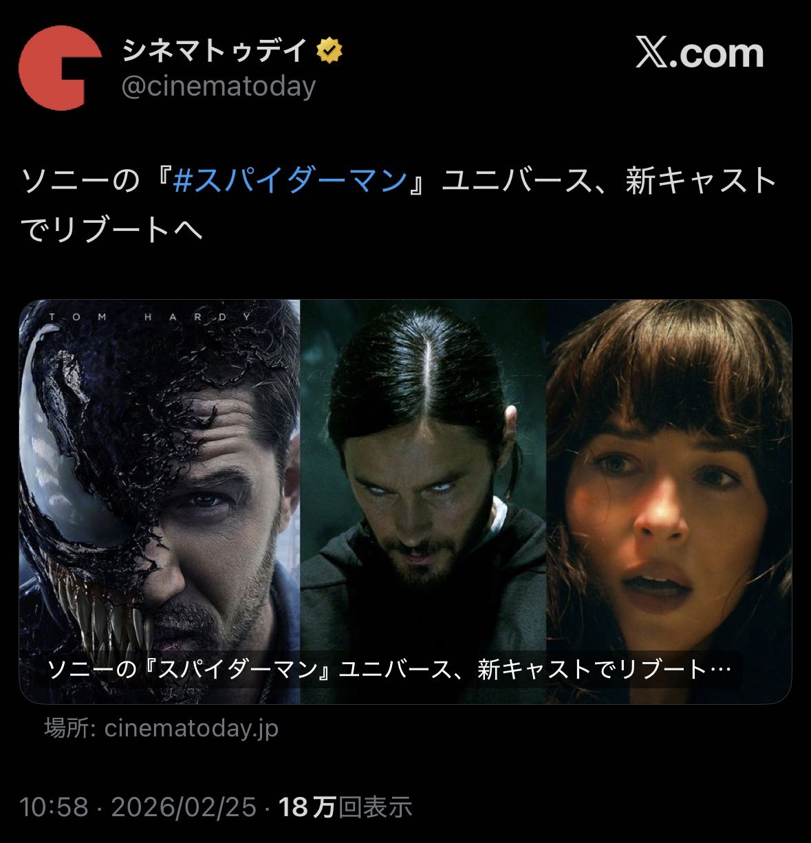 | … | 7126/02/25(水)15:14:52No.1405436261+ヴェノムも2作目でもう落ちたからスパイダーマン抜きSSUだと何も残らねえ |