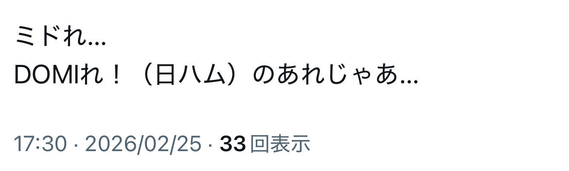 | … | 9326/02/25(水)19:06:51 ID:rNwL5lPcNo.1405492170+>日本ハムファイターズの2026年チームスローガンがDOMIれ!に決定しましたので、お知らせいたします。 |