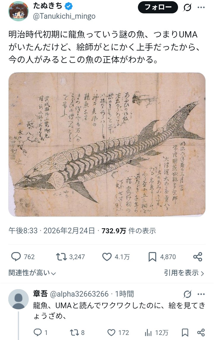 | … | 10826/02/25(水)21:20:32No.1405543028+中国の「山海経」って空想動物図鑑にも鳥の羽をもつ魚がいるって描いてあるが今だと「普通にトビウオだなコレ」ってなる |
