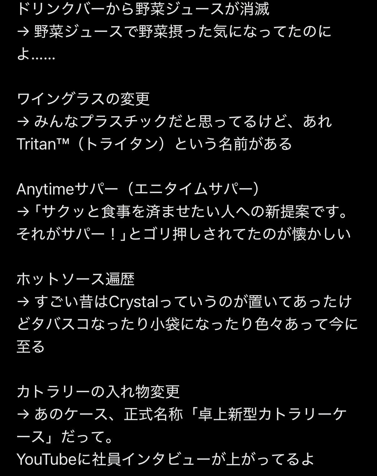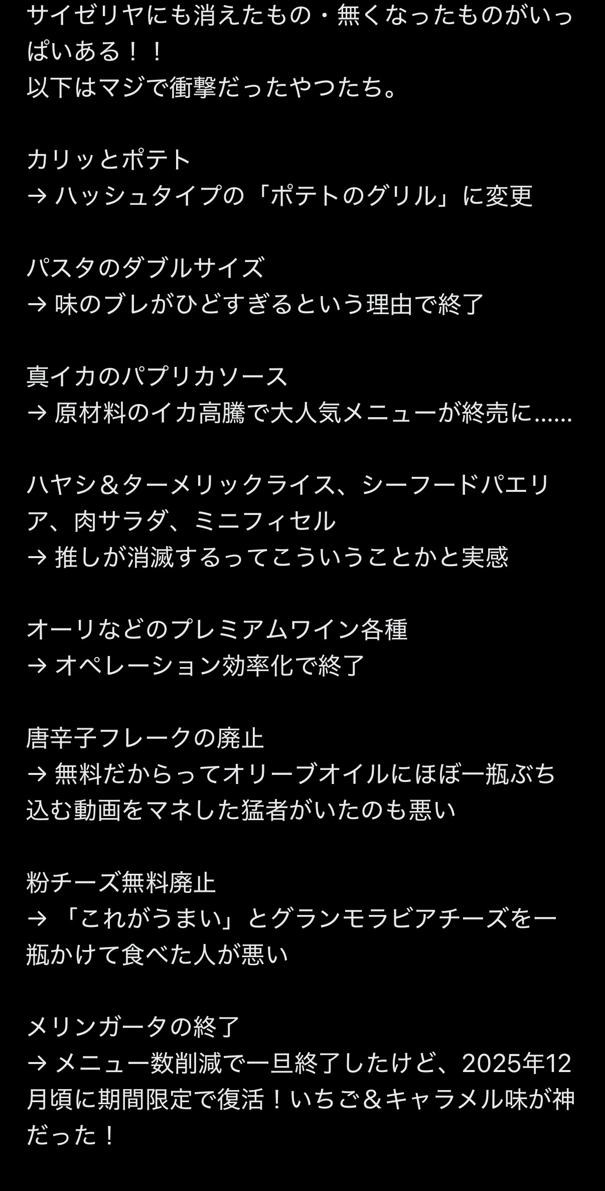 | … | 5826/02/25(水)23:32:11No.1405594210そうだねx4>一番大好きだったシェフサラダとオリーブドレッシングが消えたのが個人的にかなり痛い |