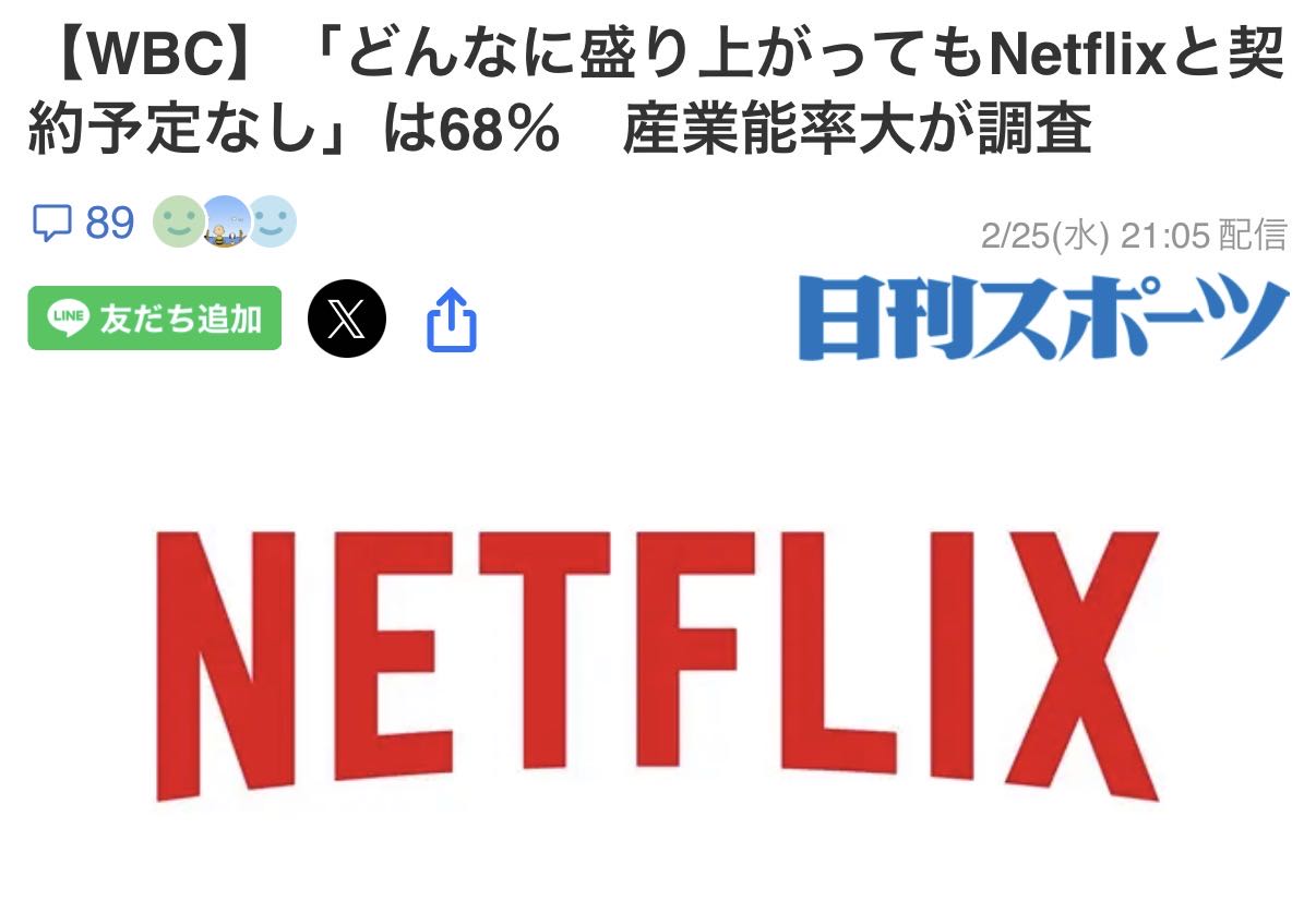 | … | 91426/02/26(木)01:58:23No.1405632588+>別にこれで儲かってるならWBC見る人が減ろうとネトフリは独占し続けると思うぞ |