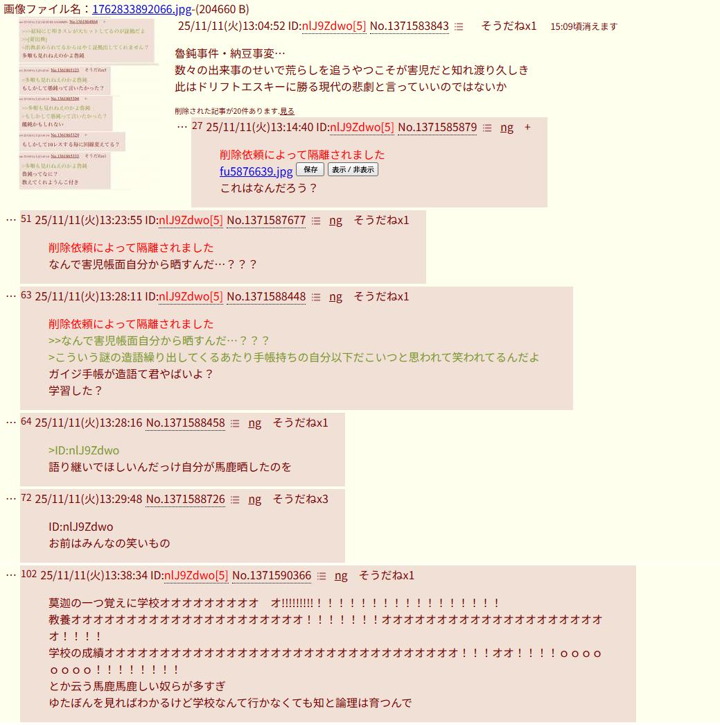 | … | 4126/02/26(木)04:45:18No.1405643184そうだねx6学校行かずに荒らしやってるとこうなるんだ… |