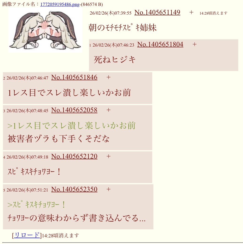 朝のモチモチスピキ姉妹このスレは古いので、もうすぐ消えます。