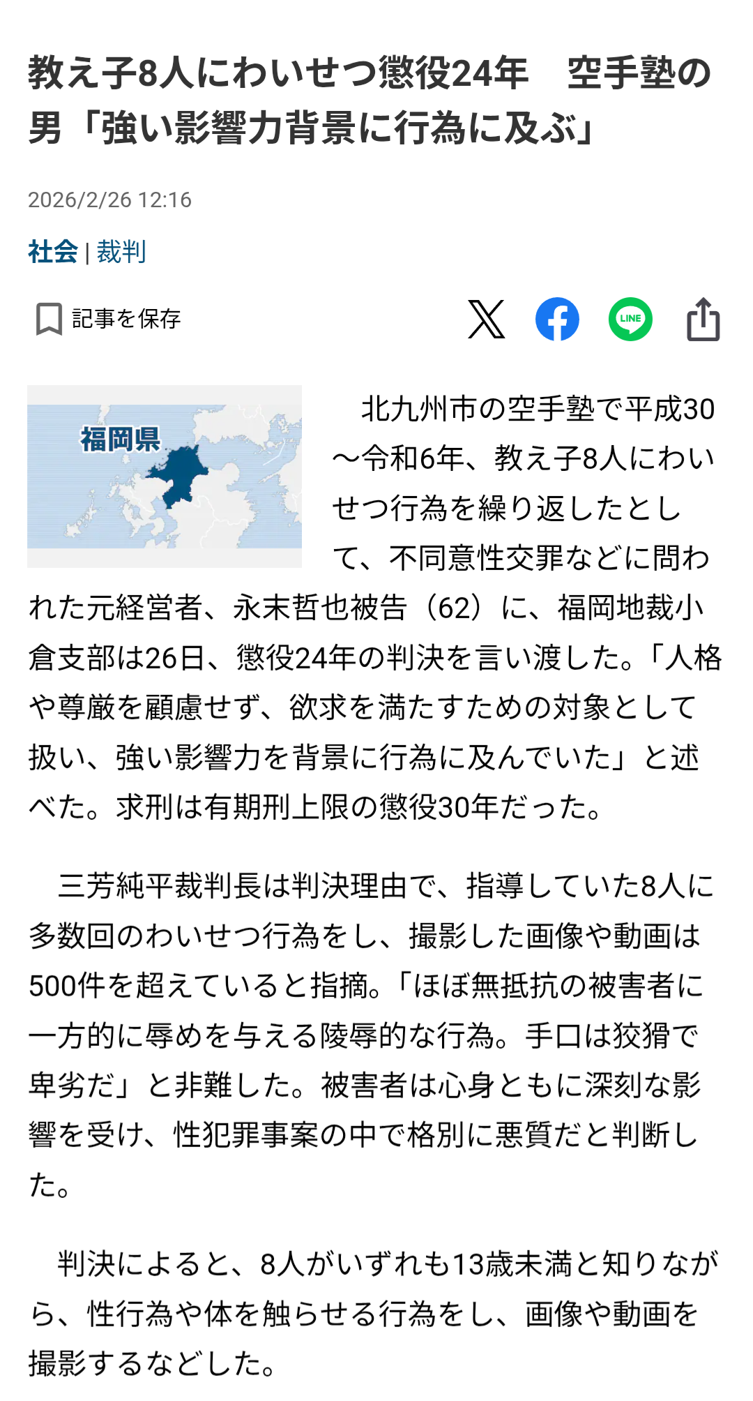 | … | 1326/02/26(木)14:49:47No.1405739884+起訴状などによりますと、永末被告は2018年から7年間、空手塾で、13歳未満であることを知りながら教え子である女子児童8人に自分の下半身を触らせるなどみだらな行為をし、その様子を撮影したなどとされています。 |
