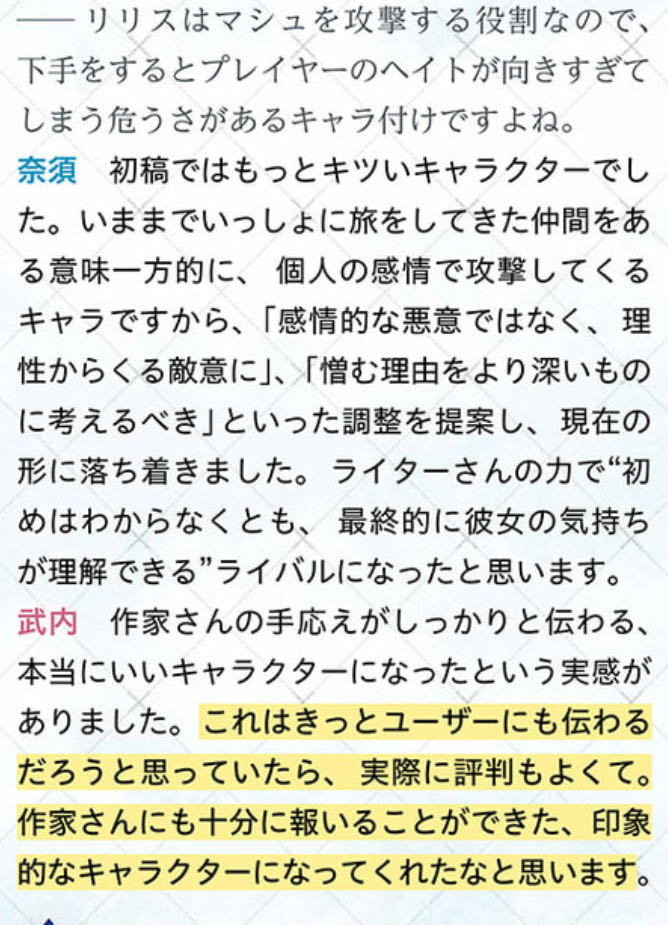 | … | 1026/02/26(木)15:10:47No.1405743887そうだねx12>初期構想だとマシュの罪指摘もなく粘着するキャラ予定っぽいのが変更になったらしいからな |