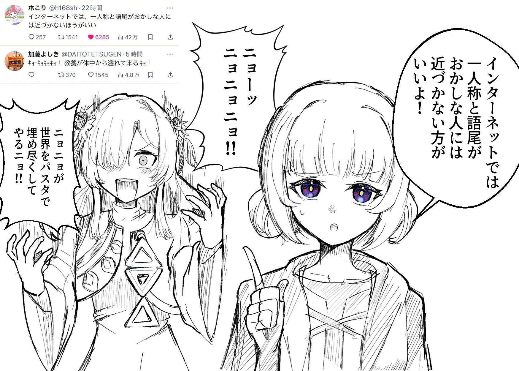 | … | 26926/02/26(木)19:13:38No.1405801555そうだねx5>>fu6346502.jpg >>こんなに可愛い絵も描けるのに脳みそはインターネットに浸されてる >そういやこの人元々神椿界隈の人だったね… >インターネットミームに脳を侵されてるけど… fu6346517.jpg 普段から描いてたとはいえインターネットミーム侵食された結果こうなるの笑う |