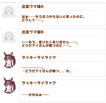 | … | 8426/02/26(木)19:58:47No.1405816876+>ここでする話じゃないかもしれないけどメイクデビュー後の勝ち/負けでイベント分岐するキャラってこれまで居たっけ? |