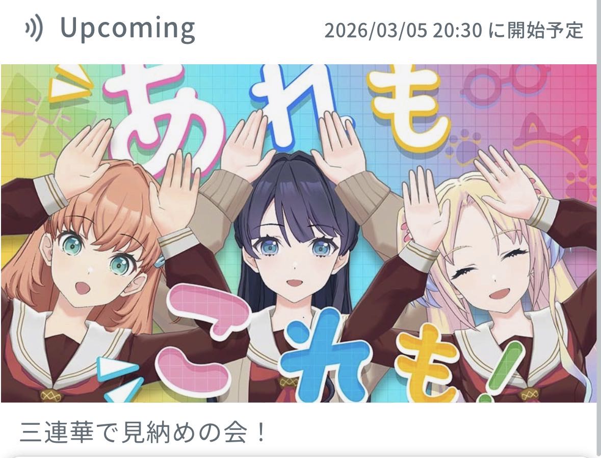 | … | 26026/02/26(木)21:06:28No.1405842815+>今月は配信で小三角あんまり見てない気がする… りとるりとで絡んでたりするからね… |