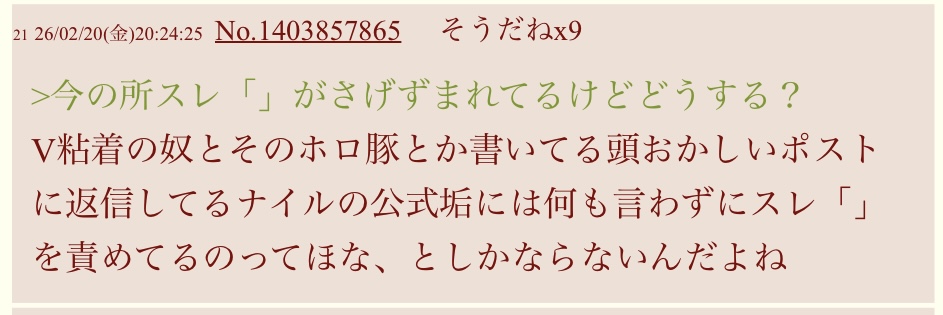 | … | 34026/02/26(木)22:55:04No.1405883291そうだねx3>このスレで延々とV用の荒らしレスコピペするぐらいVにも興味なんて持ってないよコイツ |