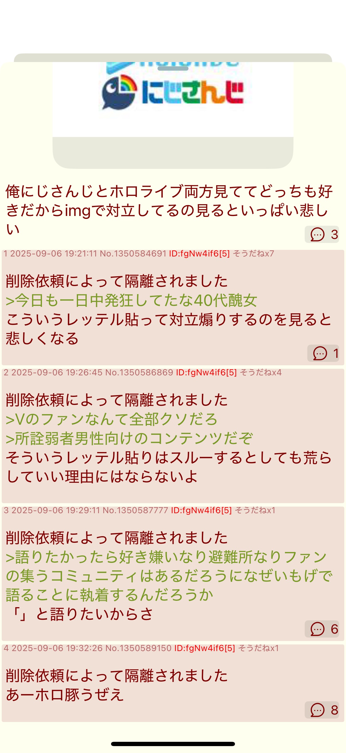 | … | 6826/02/26(木)22:17:35No.1405868922そうだねx1>このスレ画でレス少ないうちからVtuber関連の粘着が押し寄せてくるのがもうおかしいって気付け |