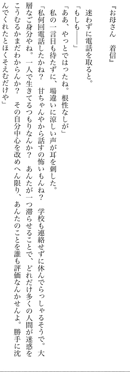 | … | 7926/02/27(金)01:03:44No.1405921374+ティーン向けの毒親描写的としてはほとんどテンプレに忠実なので |