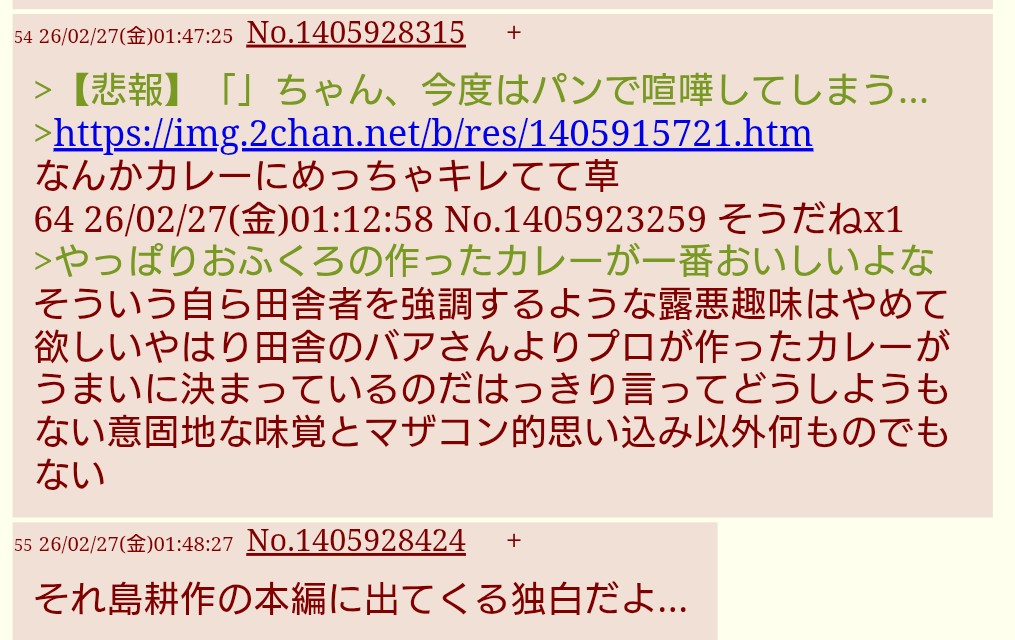 | … | 6626/02/27(金)01:52:38No.1405928907+>>>【悲報】「」ちゃん、今度はパンで喧嘩してしまう… |