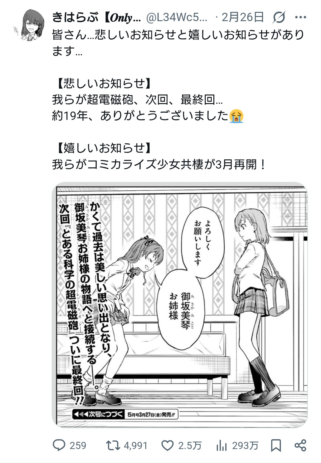 | … | 426/02/27(金)07:10:23No.1405945024+新約とある科学の超電磁砲とかになったりしない? |