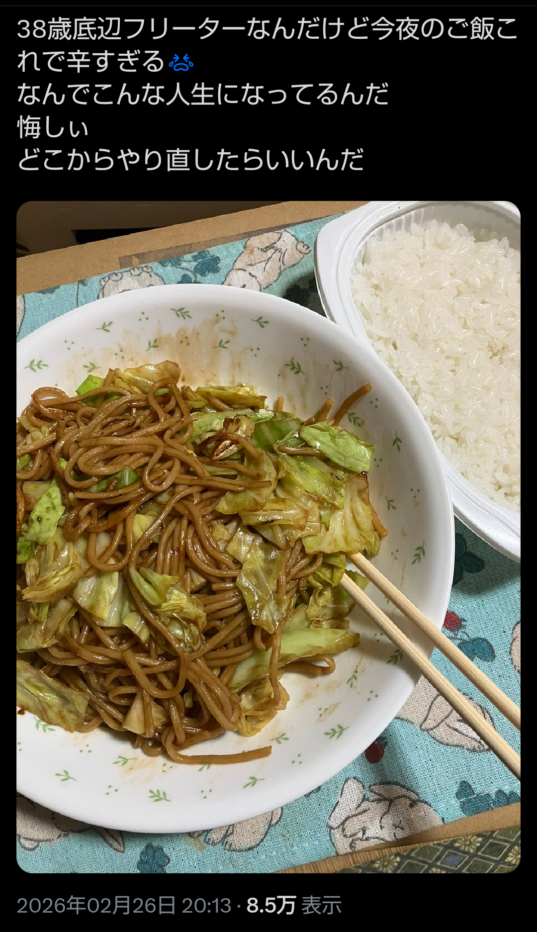| … | 9126/02/27(金)08:26:59No.1405952770+>貧乏ということと焼きそばで白米食うしかない状況は別問題なのでは? |