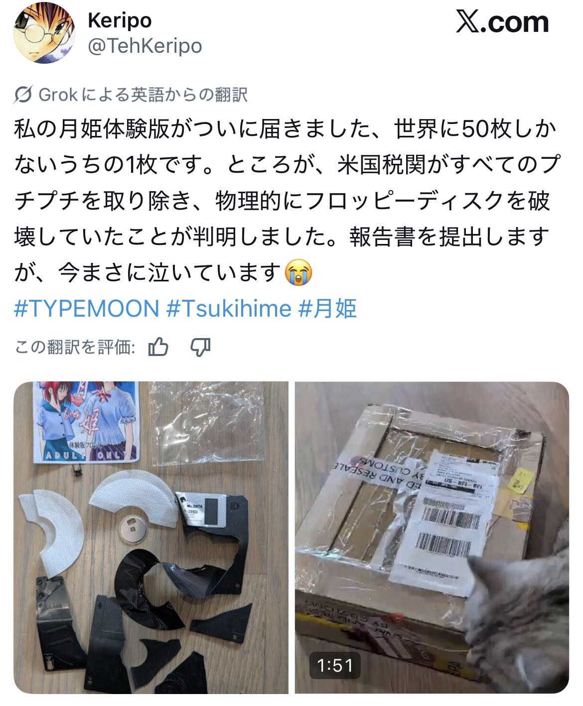 | … | 7826/02/27(金)15:29:08No.1406038022そうだねx17>梱包が若干疑われるような見た目ではあったけどフロッピーをここまで粉々にしているのは別の意図がないとやらないだろって話 |