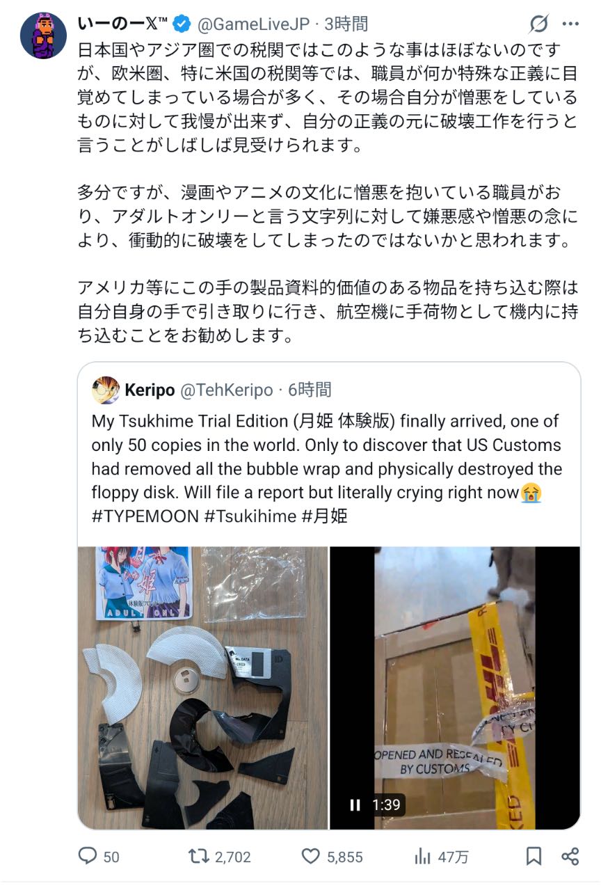 | … | 4026/02/27(金)15:23:34No.1406036843そうだねx4月姫アンチ税関職員の仕業らしいな |
