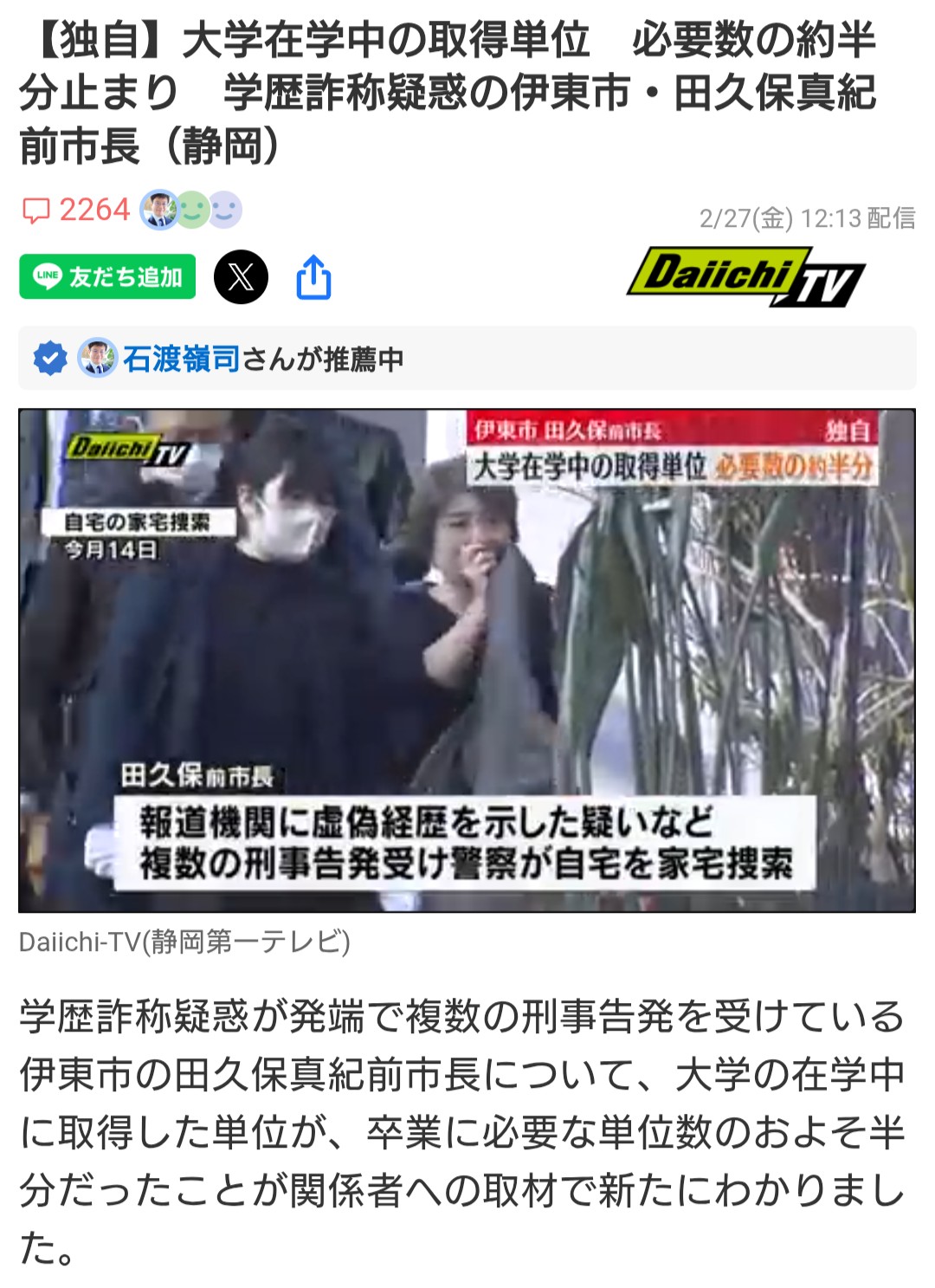 >当時卒業に必要な132単位のうち、田久保前市長が取得していたのはおよそ半分の68単位だったことが新たにわかりました。