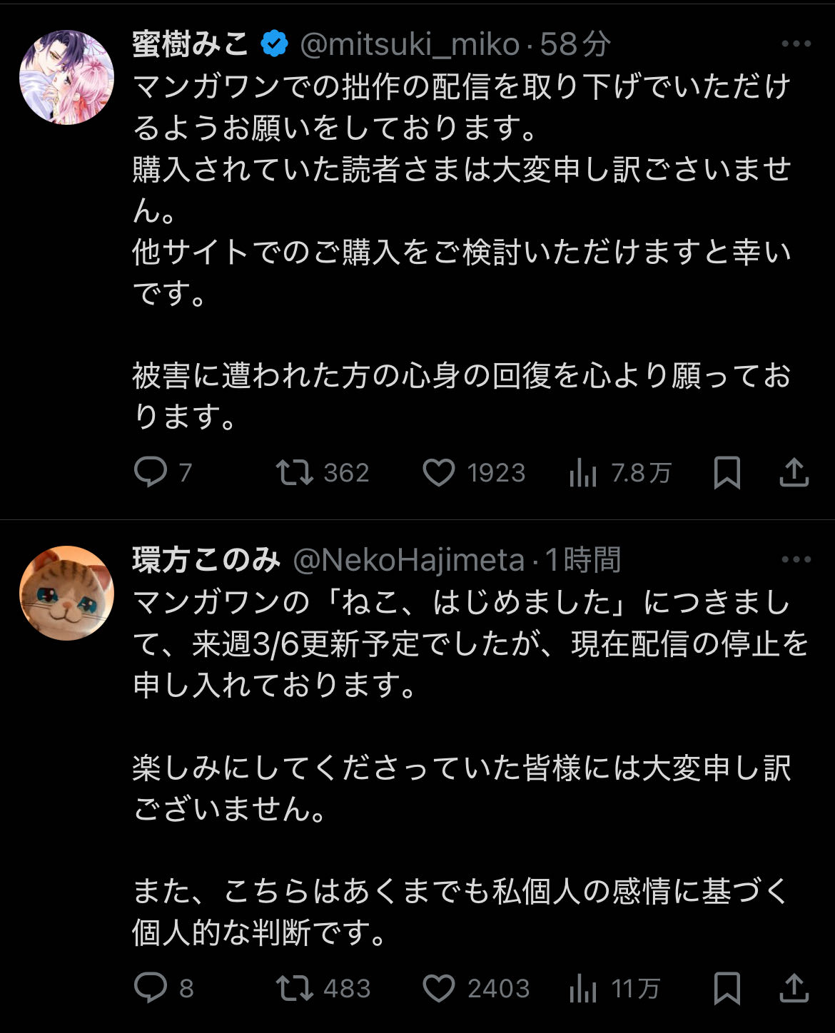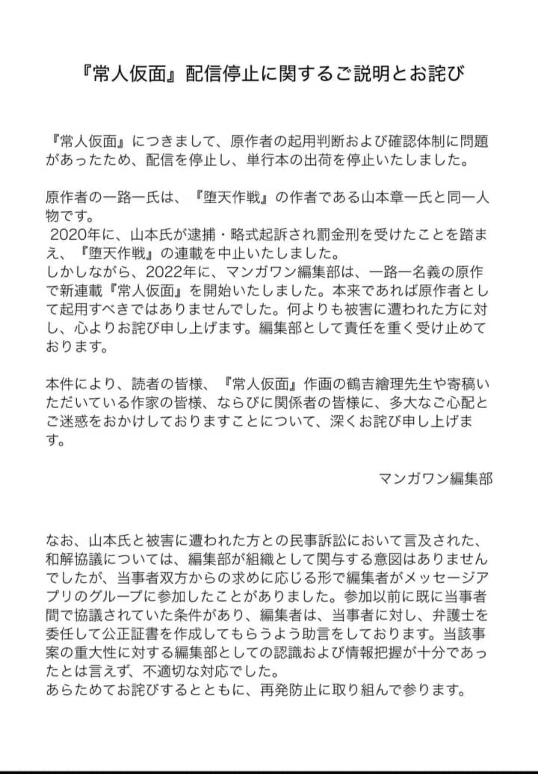 | … | 93026/02/27(金)20:45:44No.1406128188+どうして作画の人が謝罪文あげる事になってるんだよ!? |