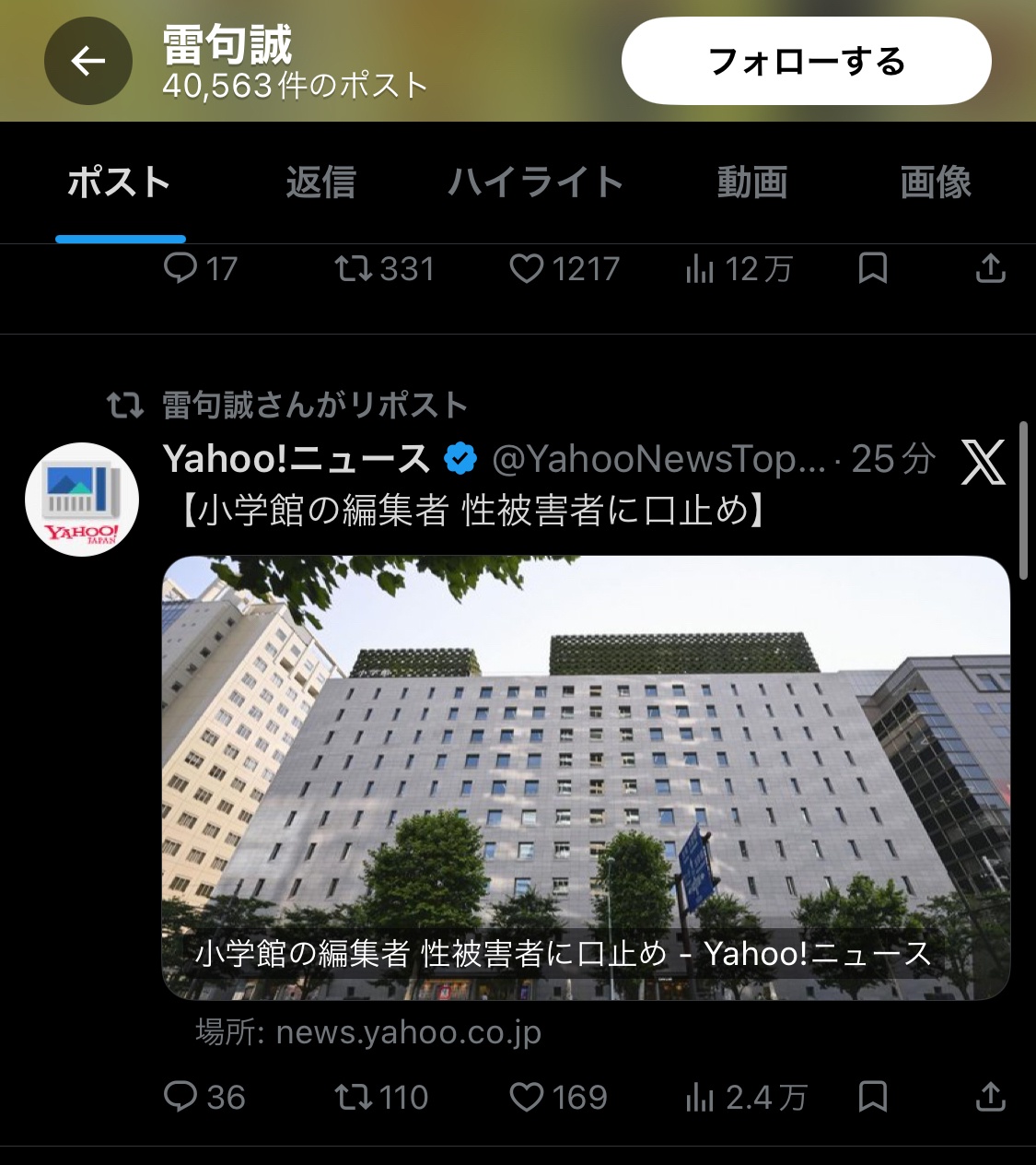 | … | 98826/02/27(金)20:47:48No.1406129096+小学館として扱われる不祥事を編集部任せにできる社長の胆力もすごいと思う |