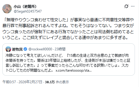 | … | 8126/02/27(金)20:12:14No.1406112863そうだねx11未成年への性犯罪への感覚が違いすぎて引く |