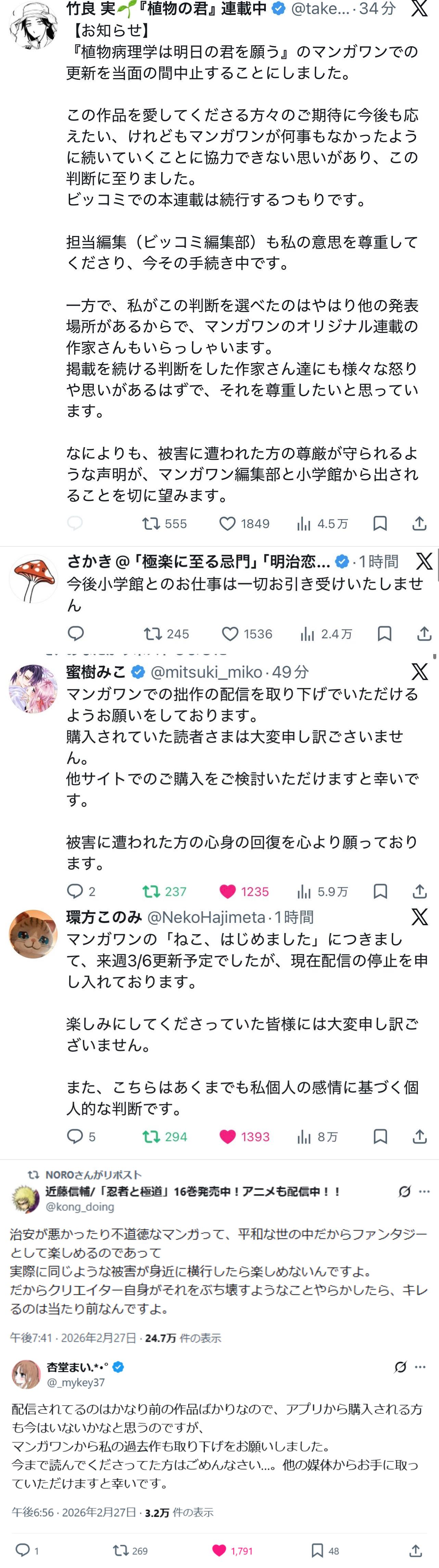 | … | 5926/02/27(金)21:43:59No.1406157990+>取り下げの人とか多いなと思ったけど誌面じゃないから連載停止もしやすいのか |