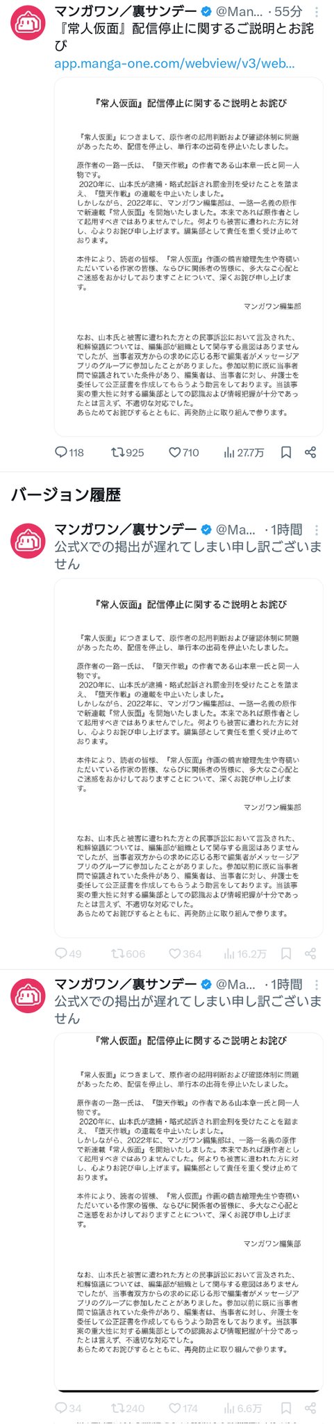 | … | 78126/02/28(土)05:54:07No.1406266832そうだねx9>本当に遺憾に思ってるならマンガワンだけじゃなく小学館自体から引き上げるくらいやれよ |