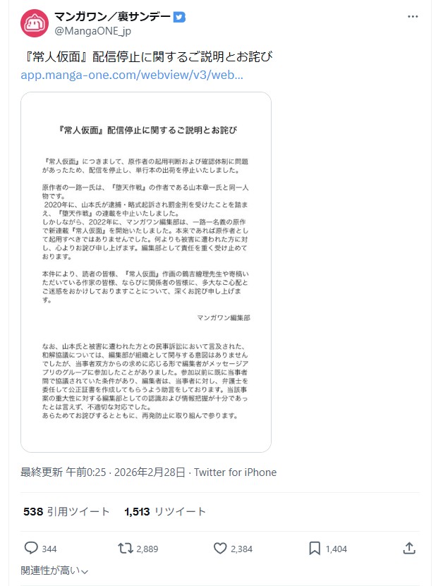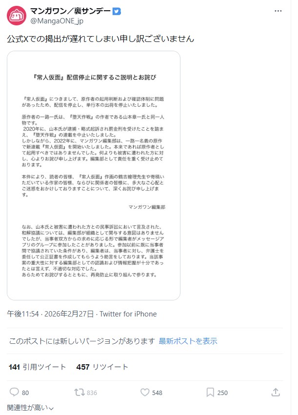 | … | 1026/02/28(土)06:39:43No.1406268499そうだねx16あくまで常人仮面配信停止のお詫びで検索やニュースにでるようにしてるし |