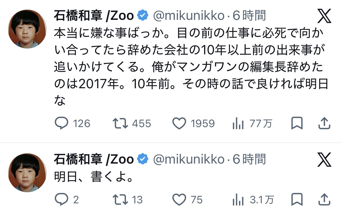 | … | 2726/02/28(土)08:12:05No.1406275532+大企業がリスク負ってまで守るべき人材だとは思えないしやっぱ編集者と個人間で深い交流があったとしか思えん |