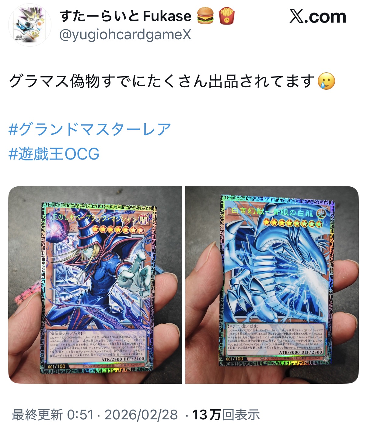 | … | 126/02/28(土)04:59:51No.1406265309そうだねx43グランドマスターレアの排出率知らないけど総数考えたら店舗から1枚排出済みになるだけで客の期待値ガタ落ちしない? |