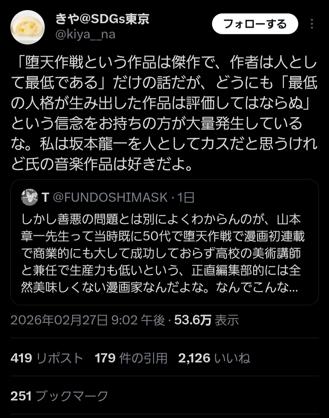| … | 5926/02/28(土)18:48:13No.1406428750そうだねx1作者と作品は分けて考えようは作品評価に関しては別で置こうぜって意味であって |