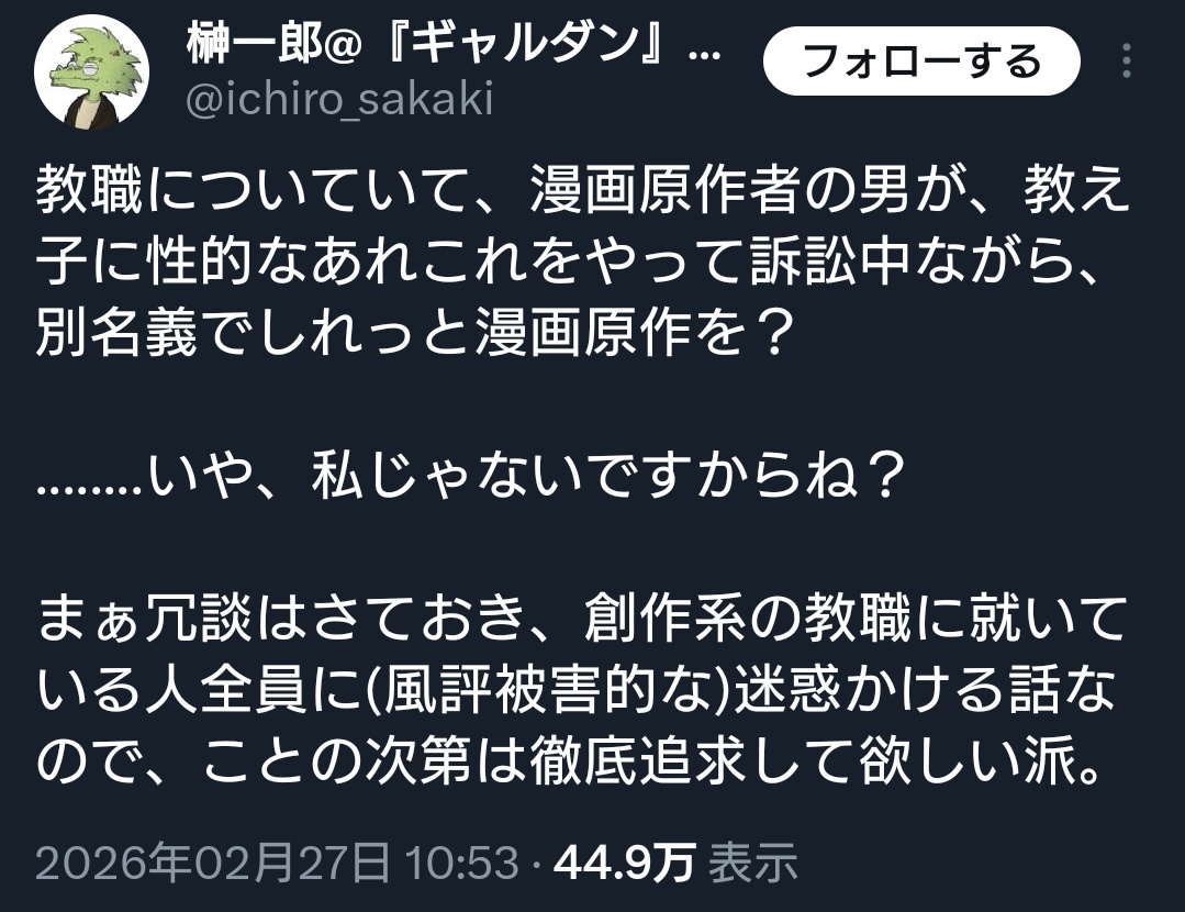 | … | 2626/02/28(土)19:22:25No.1406439645+言ってること自体は加害者の作家と小学館の対応を批判する側なのにこれで燃えてるの |
