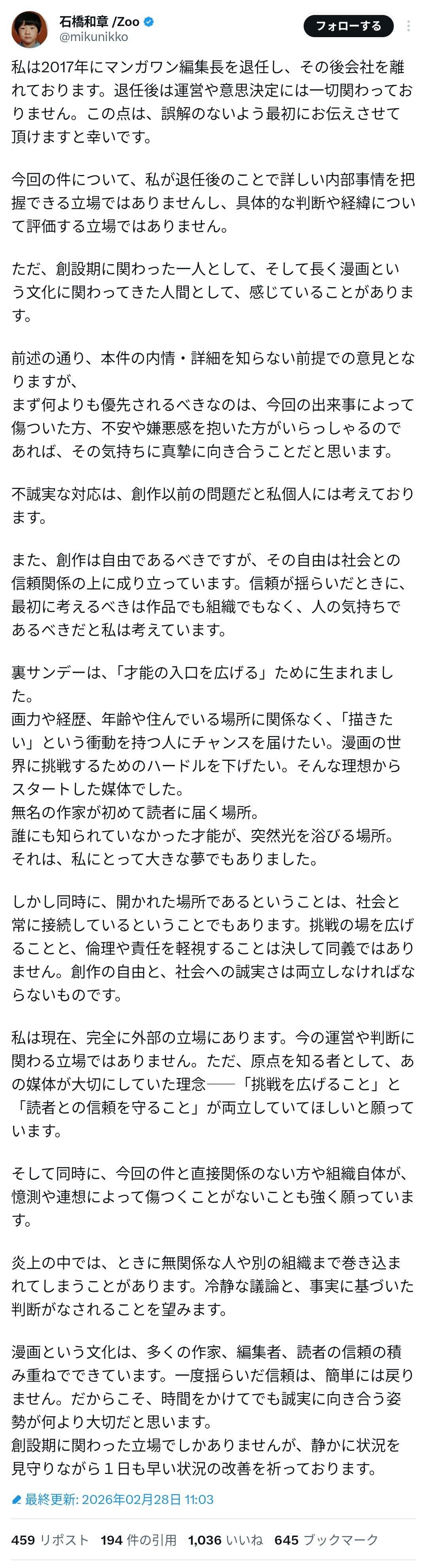 | … | 90826/02/28(土)21:14:02No.1406481732そうだねx3>>これまでの漫画業界の不祥事で迷惑かけた規模最大だと思う |