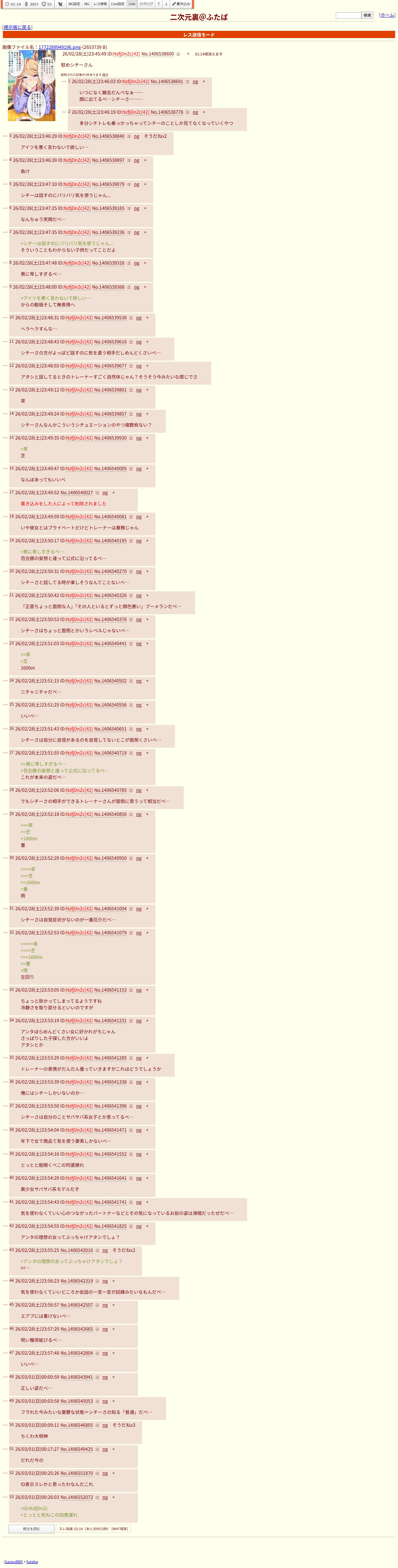 | … | 2426/02/28(土)23:51:15 ID:NzfjDnZcNo.1406540502+ニチャニチャだべ… |