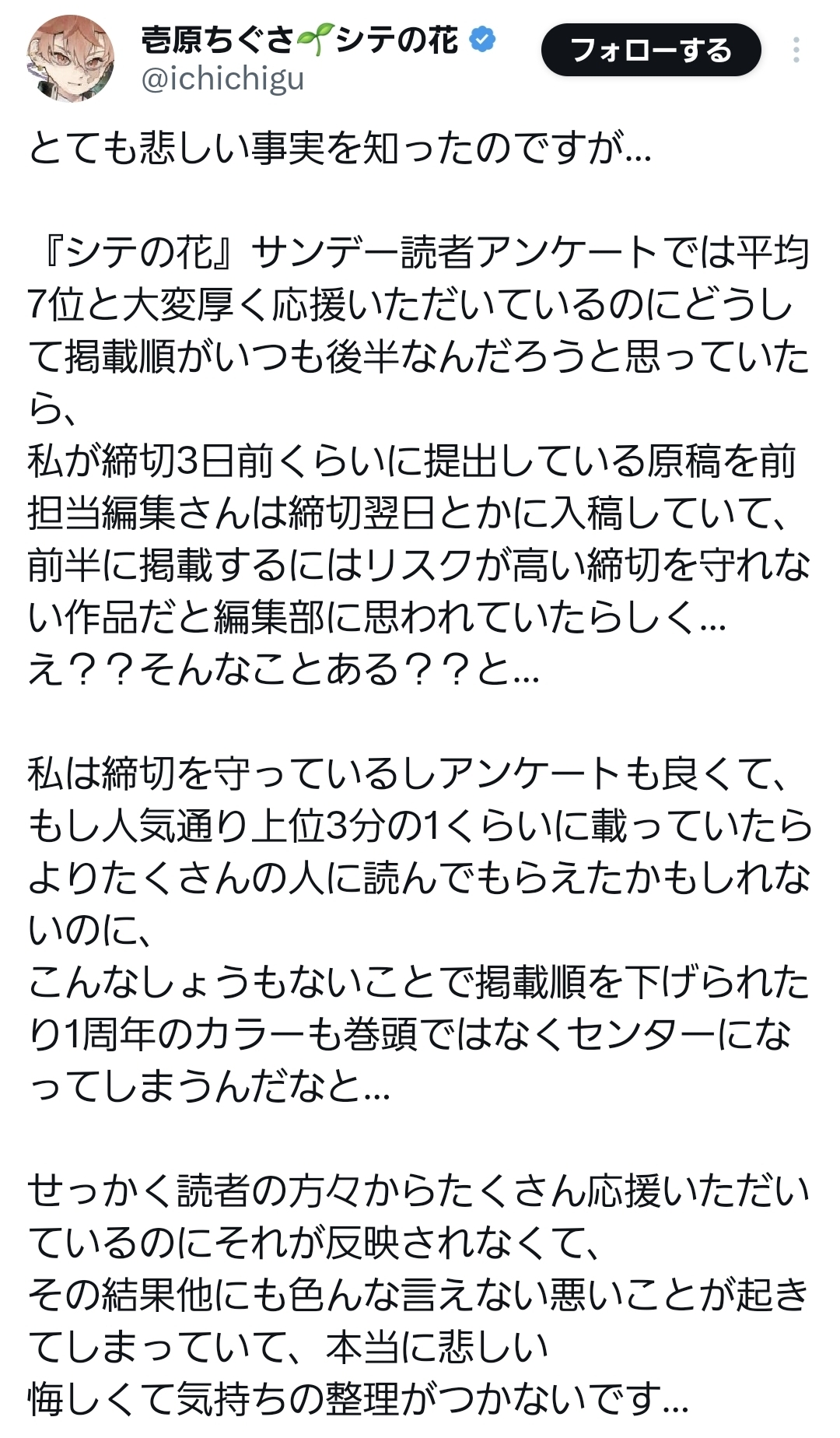 | … | 91626/03/01(日)09:06:46No.1406613448そうだねx3作家使い捨てにするこの編集部で異様に待遇が手厚いのが「有名会社の元社長の息子」だけで説明付く訳無いから |